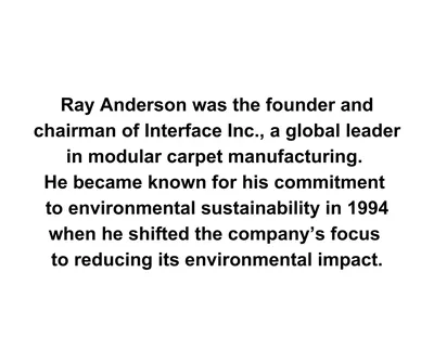 Having a visionary like Ray Anderson at the helm for many years made a profound impact on Interface. Though Ray has passed, his influence continues to shape our journey. Those who worked with him now pass on his approach to sustainability, always with a focus on commercial viability. Ray saw sustainability and profitability as inseparable. His motto, "make the call," emphasized the need to engage with customers, while also warning them of future challenges if sustainability wasn't prioritized, viewing costs in a broader, strategic context.