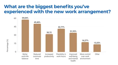 From the employee standpoint, the new work arrangements have brought a variety of benefits. A significant 59.04% of employees surveyed reported an improvement in work-life balance as the most commonly cited advantage. This was followed by a significant reduction in commute time, experienced by 49.40% of respondents. Flexibility in work hours was another key benefit, highlighted by 42.77%.