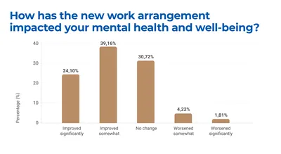 • 63.26%% of employees reported that their mental health had “improved significantly” or they have noticed ‘some improvement ‘due to the flexibility offered by hybrid work.