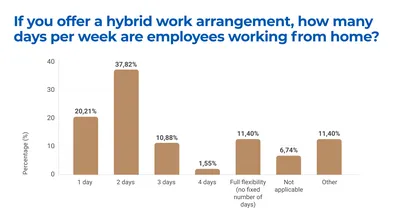• More than 40% of surveyed organisations have adopted structured hybrid models, where employees spend 1-4 days remotely and the remaining days working from office. This model allows for a balance between collaboration and focused work.