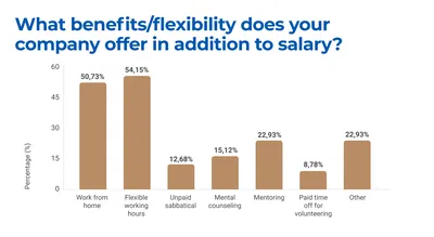 When it comes to benefits offered, flexible working hours top the list, provided by 54.15% of organisations. Work-from-home options are also popular, available in 50.73%. Mentoring programs are offered to 22.93% of respondents, while 15.12% offer mental counseling services. Furthermore, unpaid sabbaticals are available in 12.68% of employer respondents, and 8.78% provide paid time off for volunteering. Furthermore, 22.93% indicated that they offer other benefits not specified in the list.