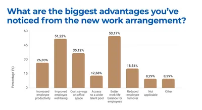 A significant 44.39% of employers surveyed reported utilizing a hybrid work model, combining both on-site and remote work. The shift to hybrid work has brought numerous advantages for both employees and organisations. 53.17% of employers observed better work-life balance for their teams, while 51.22% noted improved employee well-being. Financially, 35.12% reported cost savings on office space and 26.83% saw increased productivity among their workforce. Additionally, 18.54% experienced a reduction in employee turnover and 12.68% found that hybrid arrangements offered access to a wider talent pool. These benefits highlight why hybrid models are becoming a cornerstone of modern workplace strategies, blending flexibility and efficiency to create a more sustainable and attractive work environment.